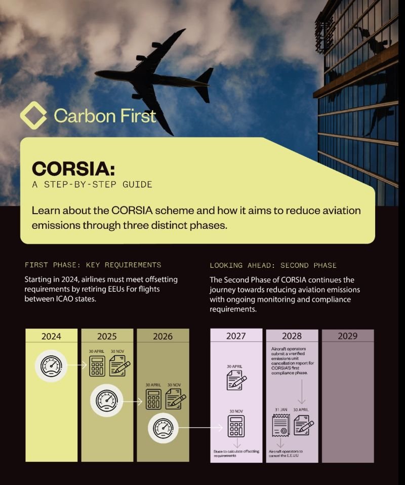 CORSIA (Carbon Offsetting and Reduction Scheme for International Aviation) is the first global compliance scheme for a specific sector. It requires airlines to offset emissions above 85% of 2019 levels.