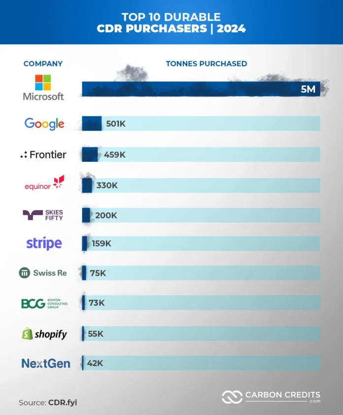 Microsoft accounted for 63% of total CDR purchase volume in 2024 to achieve carbon negativity by 2030. The tech giant secured around 5.1 million metric tons of durable CDR credits.